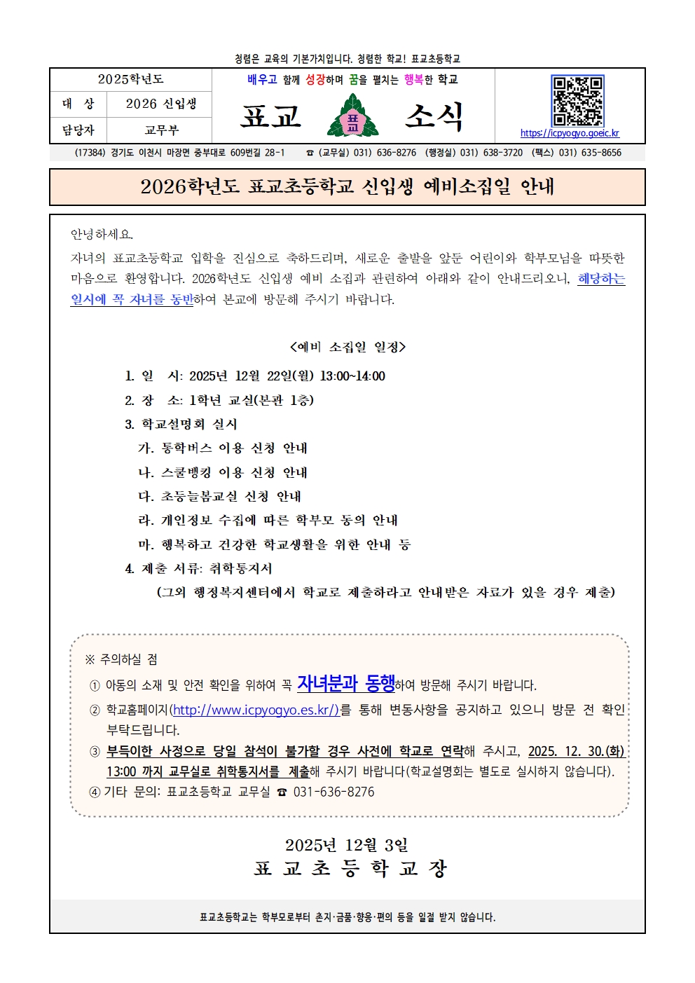 - 2025-12-18 2026학년도 표교초등학교 신입생 예비소집일 안내