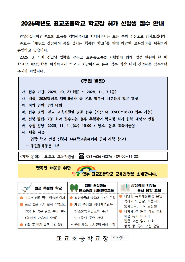 - 2025-09-29 2026학년도 표교초등학교 학교장 허가 신입생 접수 안내